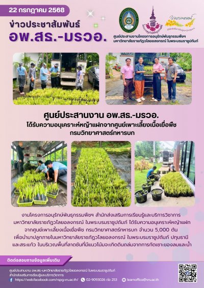 22 กรกฎาคม 2568 มหาวิทยาลัยราชภัฏวไลยอลงกรณ์ ในพระบรมราชูปถัมภ์ ได้รับความอนุเคราะห์หญ้าแฝก จากศูนย์เพาะเลี้ยงเนื้อเยื่อพืช กรมวิทยาศาสตร์ทหารบก จำนวน 5,000 ต้น