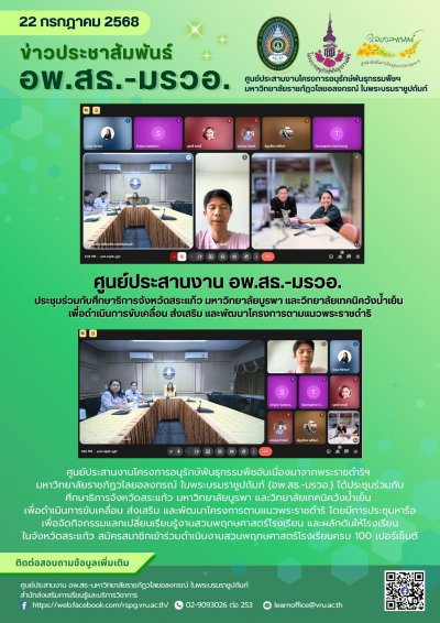 22 กรกฎาคม 2568 อพ.สธ.-มรวอ.ได้ประชุมร่วมกับ ศึกษาธิการจังหวัดสระแก้ว มหาวิทยาลัยบูรพา และวิทยาลัยเทคนิควังน้ำเย็น