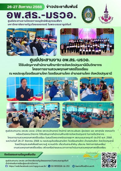26-27 สิงหาคม 2568 อพ.สธ.-มรวอ. ได้รับเชิญจากสำนักงานศึกษาธิการจังหวัดปทุมธานี ในการเป็นวิทยากรโครงการงานสวนพฤกษศาสตร์โรงเรียน ในสมเด็จพระเทพรัตนราชสุดาฯ สยามบรมราชกุมารี ประจำปี พ.ศ. 2568