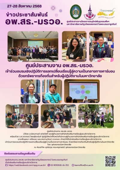 ขอเชิญเข้าร่วมฝึกอบรมเชิงปฏิบัติการงานฐานทรัพยากรท้องถิ่น หลักสูตร 6 งานฐานทรัพยากรท้องถิ่น รุ่นที่ 2/2568 ระหว่างวันที่ 13-16 พฤษภาคม 2568 ณ อาคารปฏิบัติการศูนย์ประสวานงานโครงการอนุรักษ์พันธุกรรมพืชฯ มหาวิทยาลัยราชภัฏวไลยอลงกรณ์ ในพระบรมราชูปถัมภ์ จังหวั