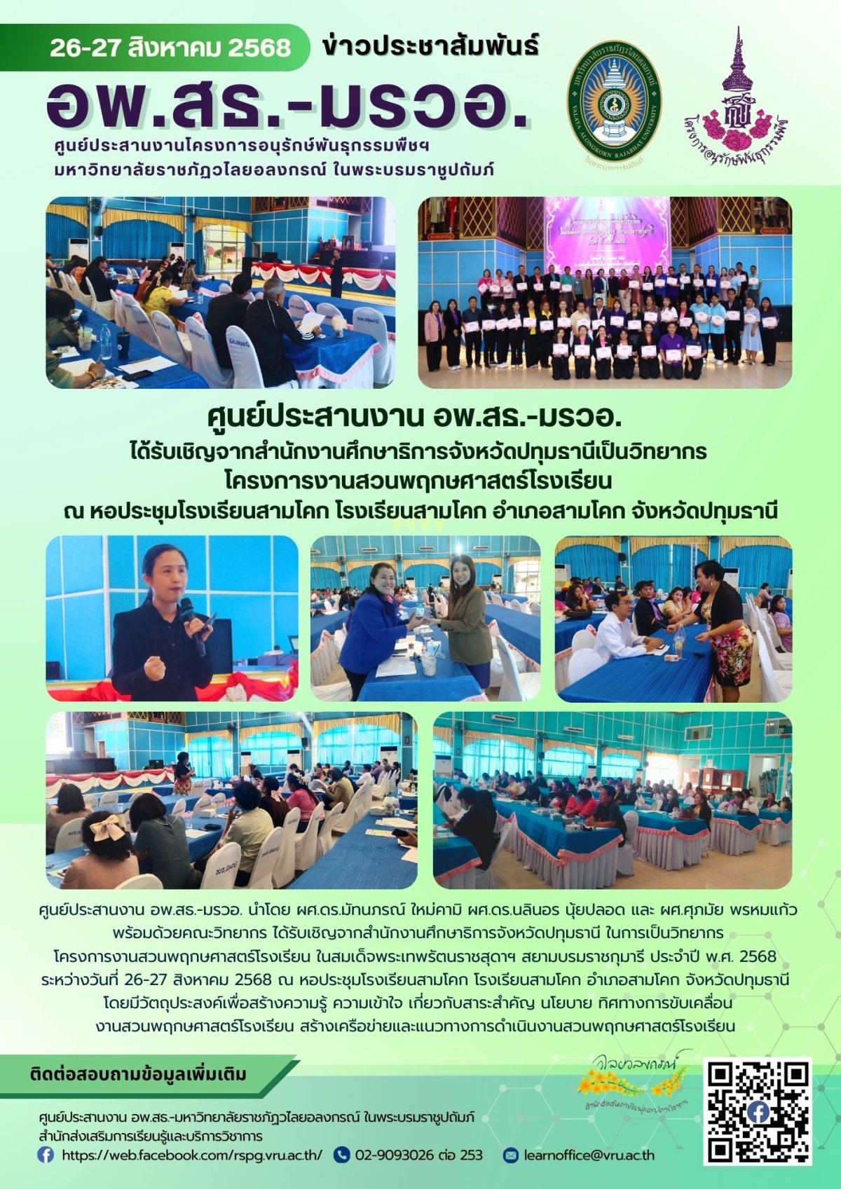 ในพระบรมราชูปถัมภ์ (อพ.สธ.-มรวอ.) นำโดย ผศ.ดร.มัทนภรณ์ ใหม่คามิ ผศ.ดร.นลินอร นุ้ยปลอด และ ผศ.ศุภมัย พรหมแก้ว พร้อมด้วยคณะวิทยากร ได้รับเชิญจากสำนักงานศึกษาธิการจังหวัดปทุมธานี ในการเป็นวิทยากรโครงการงานสวนพฤกษศาสตร์โรงเรียน ในสมเด็จพระเทพรัตนราชสุดาฯ สยามบรมราชกุมารี ประจำปี พ.ศ. 2568