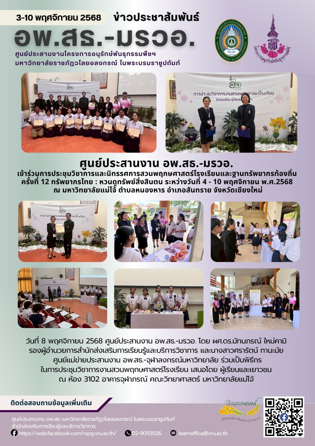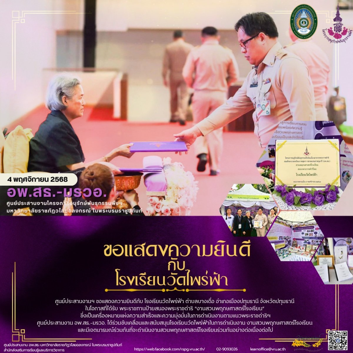 การฝึกอบรมปฏิบัติการงานสวนพฤกษศาสตร์โรงเรียน หลักสูตร 5 องค์ประกอบ รุ่นที่ 1/2569 ระหว่างวันที่ 25 - 28 พฤศจิกายน 2568 ณ ห้องประชุมศาสตร์พระราชา มหาวิทยาลัยราชภัฏวไลยอลงกรณ์ ในพระบรมราชูปถัมภ์ สระแก้ว ตำบลท่าเกษม อำเภอเมือง จังหวัดสระแก้ว วันที่ 28 พฤศจิกายน 2568ผศ.ดร.ชัยวุฒิ เทโพธิ์ รองอธิการบดี เป็นประธานในพิธีปิดโครงการฝึกอบรมปฏิบัติการงานสวนพฤกษศาสตร์โรงเรียน หลักสูตร 5 องค์ประกอบ ทั้งนี้ผู้เข...