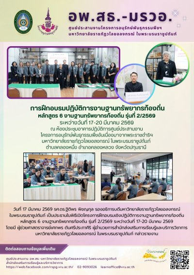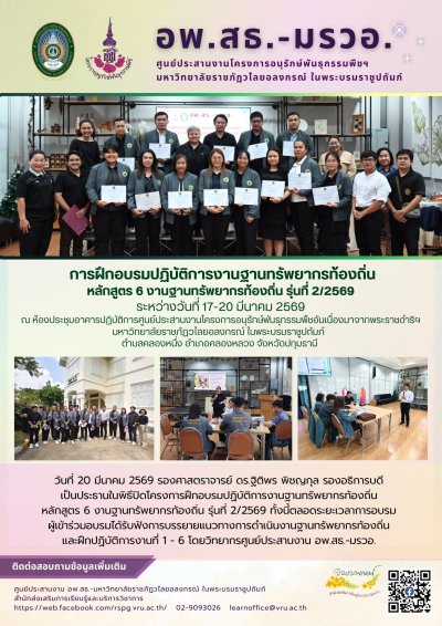 17 มีนาคม 2569 โครงการฝึกอบรมเชิงปฏิบัติการงานฐานทรัพยากรท้องถิ่น หลักสูตร 6 งานฐานทรัพยากรท้องถิ่น รุ่นที่ 2/2569 ระหว่างวันที่ 17-20 มีนาคม 2569