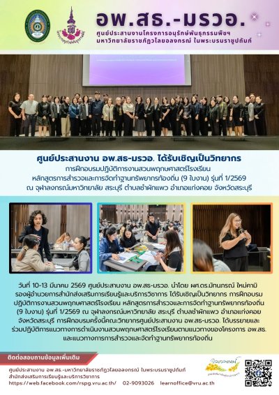 ขอเชิญเข้าร่วมการฝึกอบรมปฏิบัติการงานฐานทรัพยากรท้องถิ่น หลักสูตร 6 งานฐานทรัพยากรท้องถิ่น รุ่นที่ 2/2569 ระหว่างวันที่ 17 - 20 มีนาคม 2569
